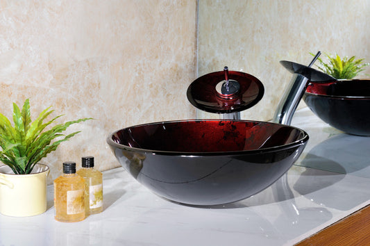 Marumba Deco-Glass Vessel Sink in Tempered Red and Black with Matching Chrome Waterfall Faucet