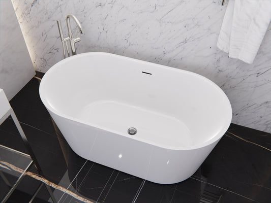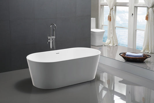 Chand Series 55 in. x 30 in. Flat Bottom Acrylic Freestanding Soaking Bathtub with Center Drain in Glossy White