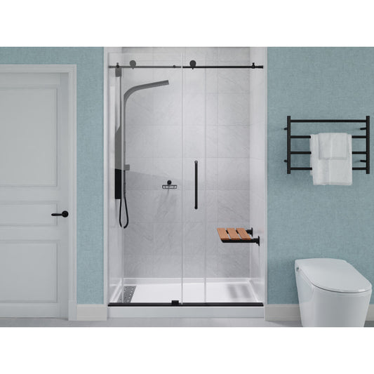 Saxon 17 in. Teak Wall Mounted Folding Shower Seat in Matte Black
