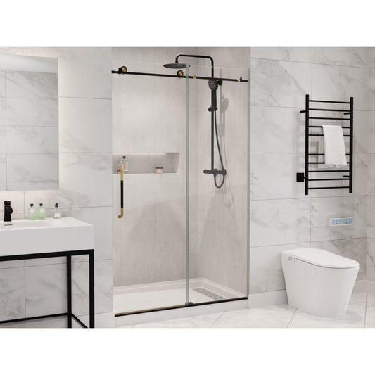 Madam Series 76-in. x 48-in. Frameless Sliding Shower Door in Matte Black and Brushed Gold