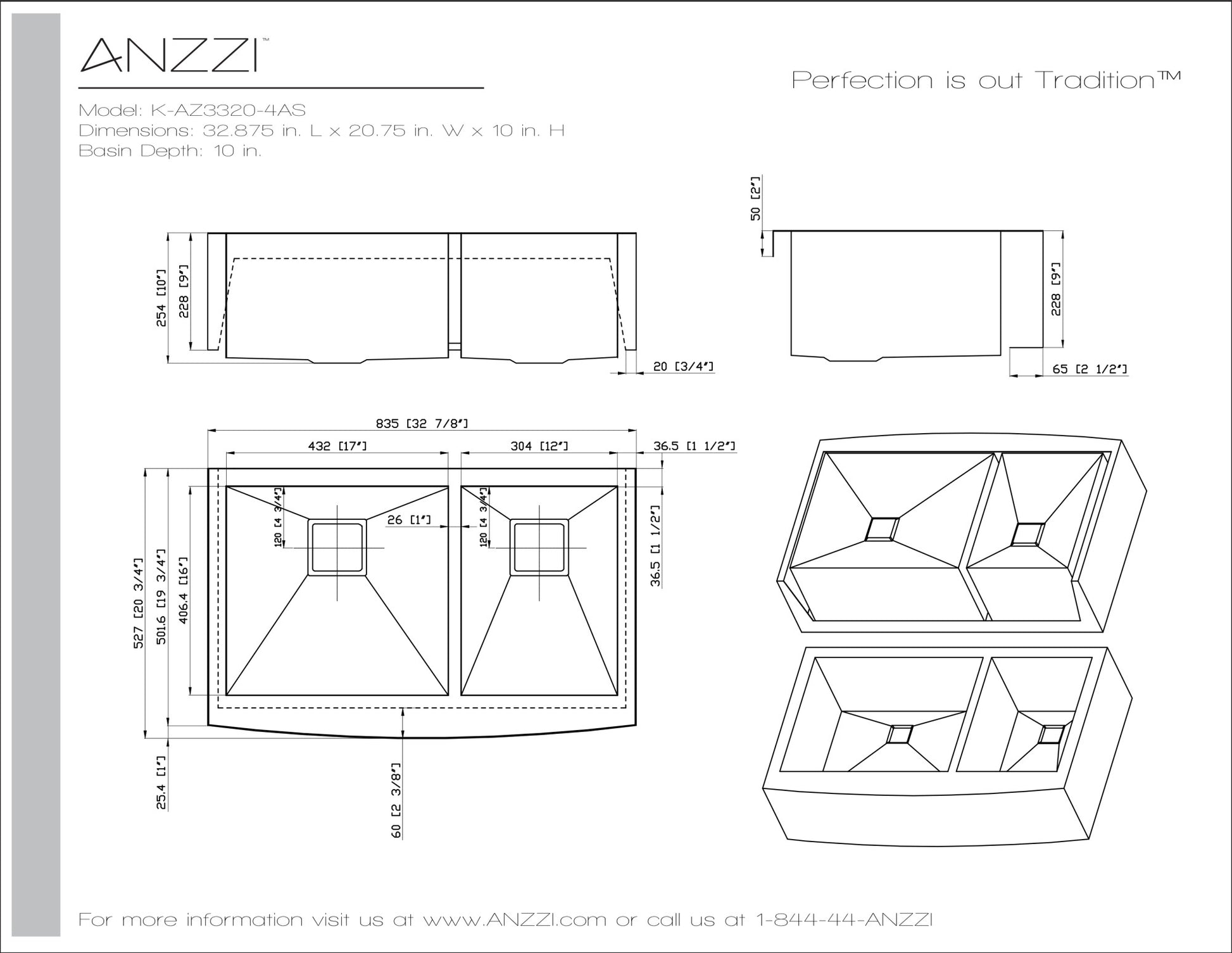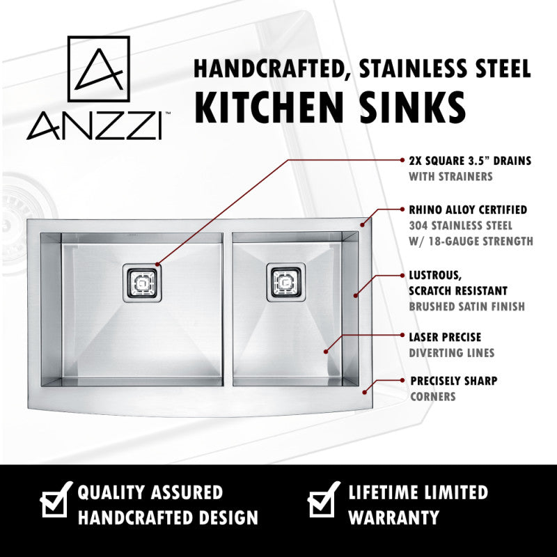 ANZZI presents the 33 inch ELYSIAN SERIES hand crafted farmhouse kitchen sink. Representing the latest in modern home fixture designs and traditional European crafting technique this stunning display of artistry is hand shaped to perfection using RHINO ALLOY certified 18 gauge 304 stainless steel. Only ANZZI hand crafted farmhouse kitchen sinks utilize RHINO ALLOY certified materials for superior strength and quality. The cavernous 60/40 deep soaking dual basin will comfortably accommodate the largest dish loads including pots, pans and more. And every ANZZI sink features the largest Echo-STOP sound dampening pads available and a layer of protective composite coating to further quiet noise and prevent condensation. Well defined diversion lines ensure quick and total water drainage and the subtly curved corners allow of easier cleaning. ANZZI carries a proud tradition of crafting long lasting, quality home fixtures. With ANZZI perfection is our tradition.