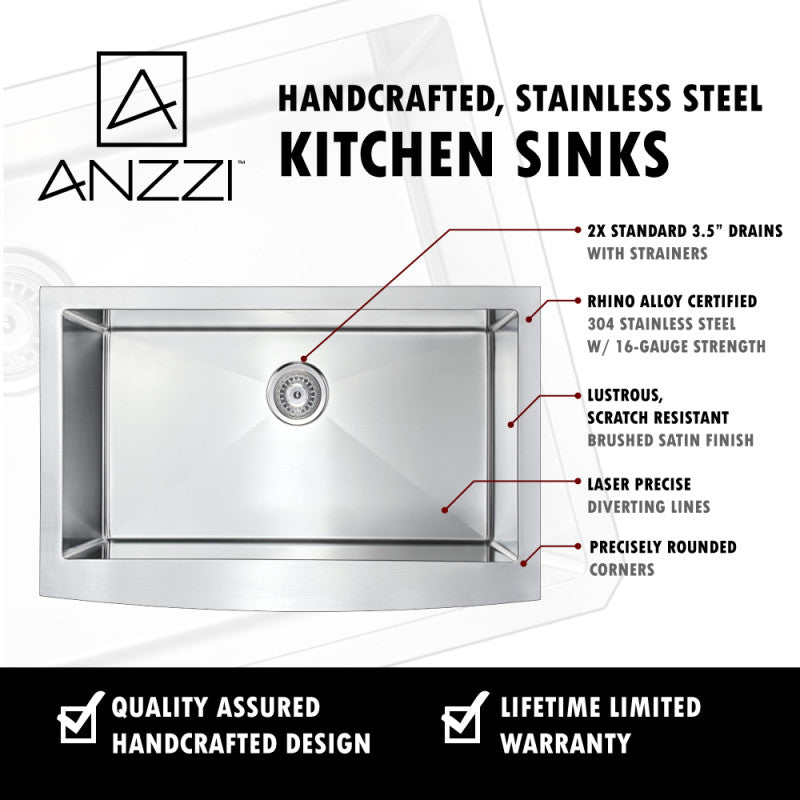 ANZZI presents the 32 in. ELYSIAN SERIES hand crafted farmhouse kitchen sink. Representing the latest in modern home fixture designs and traditional European crafting technique this stunning display of artistry is hand shaped to perfection using RHINO ALLOY certified 16-Gauge 304 stainless steel. Only ANZZI hand crafted farmhouse kitchen sinks utilize RHINO ALLOY certified materials for superior strength and quality. The cavernous deep soaking basin will comfortably accommodate the largest dish loads including pots, pans and more. And every ANZZI sink features extra-large Echo-STOP sound dampening pads and a layer of protective composite coating to further quiet noise and prevent condensation. Each ANZZI faucet has been certified as Water Sense approved with solid brass construction and valve included. Well defined diversion lines ensure quick and total water drainage and the subtly curved corners allow of easier cleaning. ANZZI carries a proud tradition of crafting long lasting, quality home fixtures. With ANZZI perfection is our tradition.