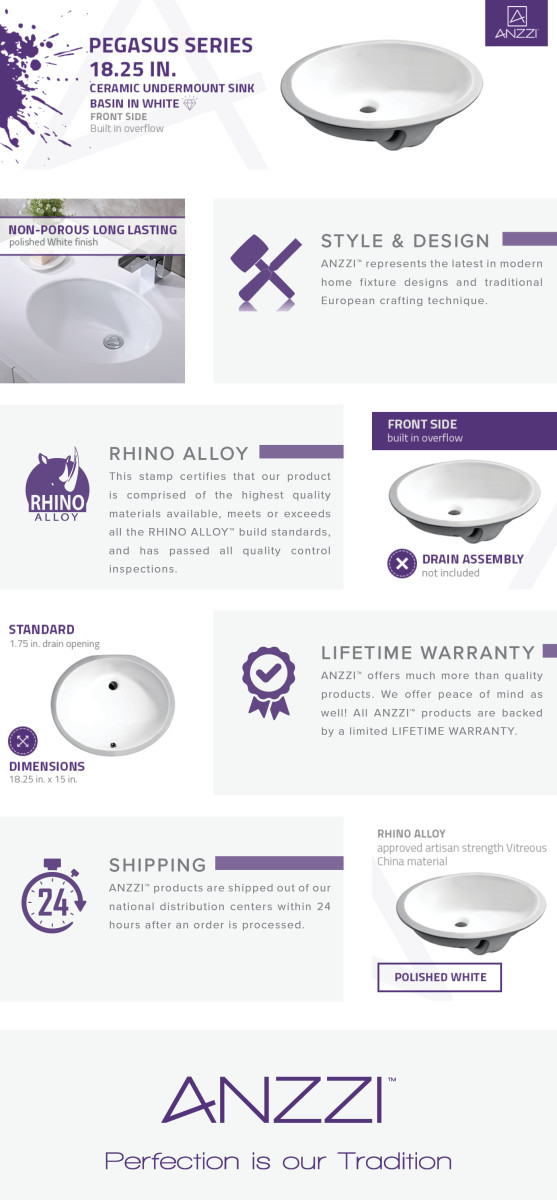 Introduce an exquisite piece of modern contemporary artistry to your wash room with the ANZZI Pegasus Series undermount Vitreous China bathroom sink. The ANZZI Pegasus is crafted using the finest quality Vitreous China resulting in a smoothly polished basin with the delicate features of fine china and the stubborn durability of high end ceramics. ANZZI continues to deliver the latest trends and modern styles to your home to help you build your ideal living space.