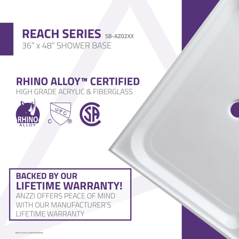 Reach Base Series 36 in. L x 48 in. W Alcove Shower Shower Pan Base with Center Drain in Glossy White Marine Acrylic