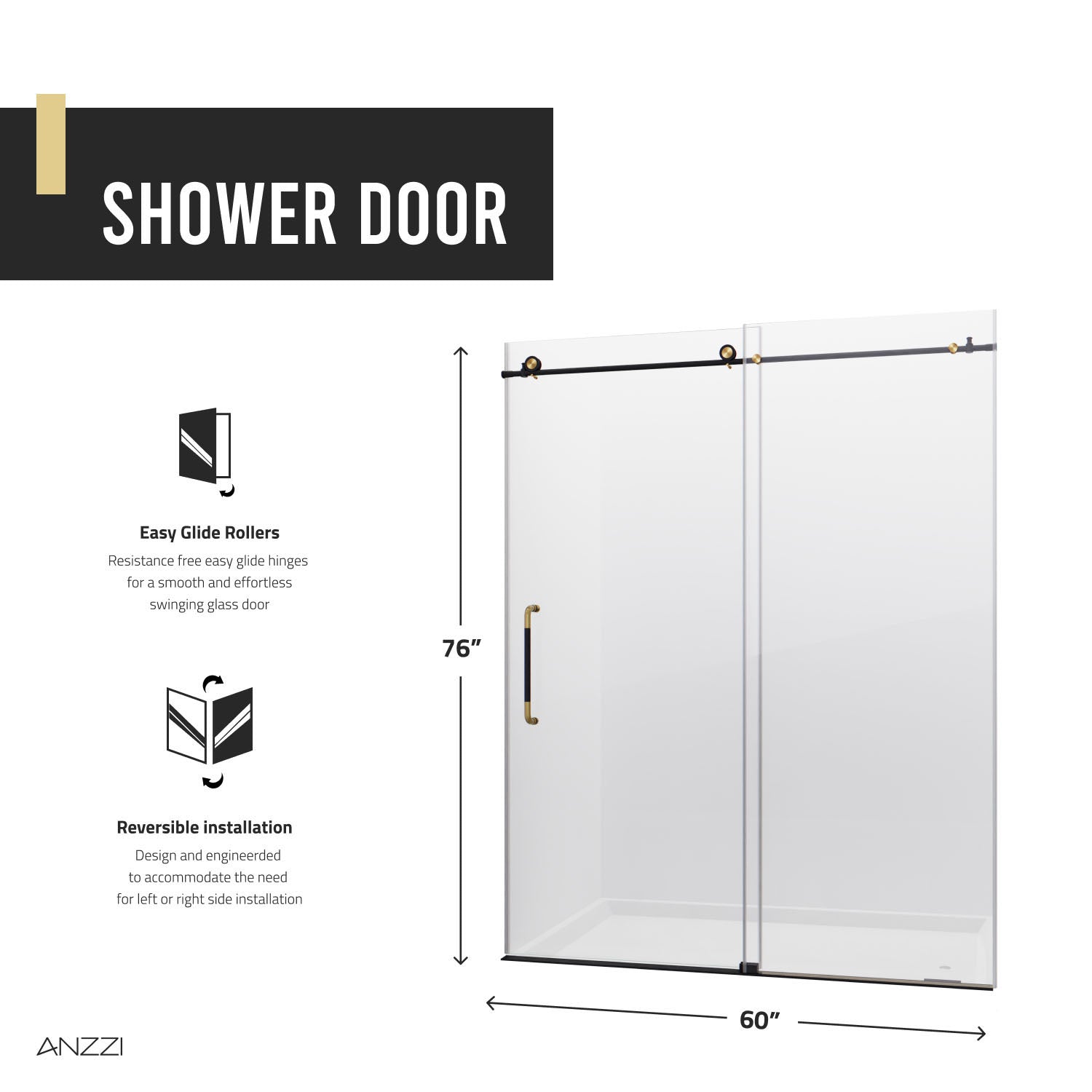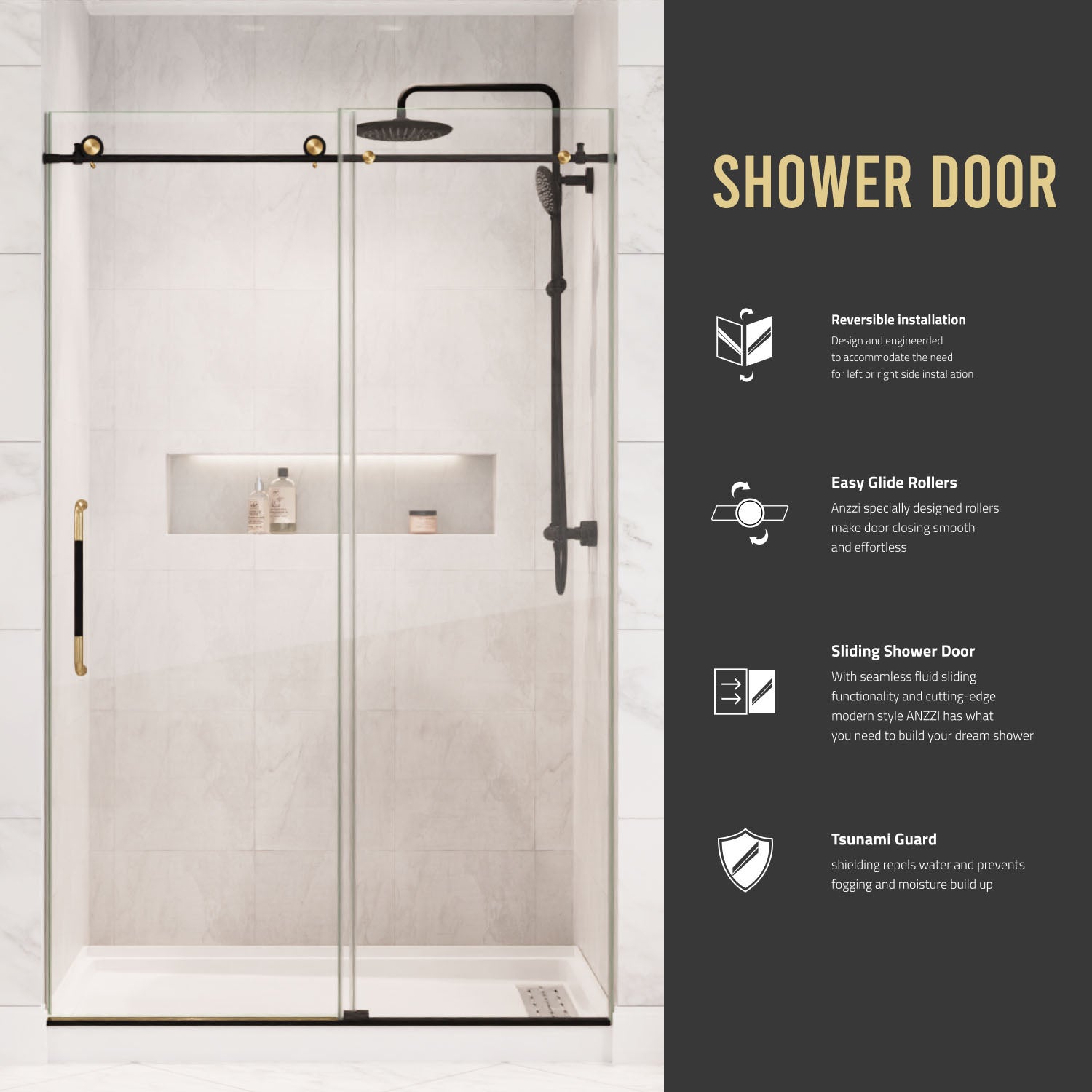 ANZZI continues its tradition of innovative home design with the Madam Series shower glass door. The ANZZI Madam Series features a modern marriage of tempered, crystal clear, DECO-GLASS panels with stainless steel RHINO ALLOY approved hardware finish in beautiful Matte Black. ANZZI's own TSUNAMI GUARD shielding repels water and prevents fogging and moisture build up. With seamless fluid sliding functionality and cutting edge modern style ANZZI has what you need to build your dream shower.