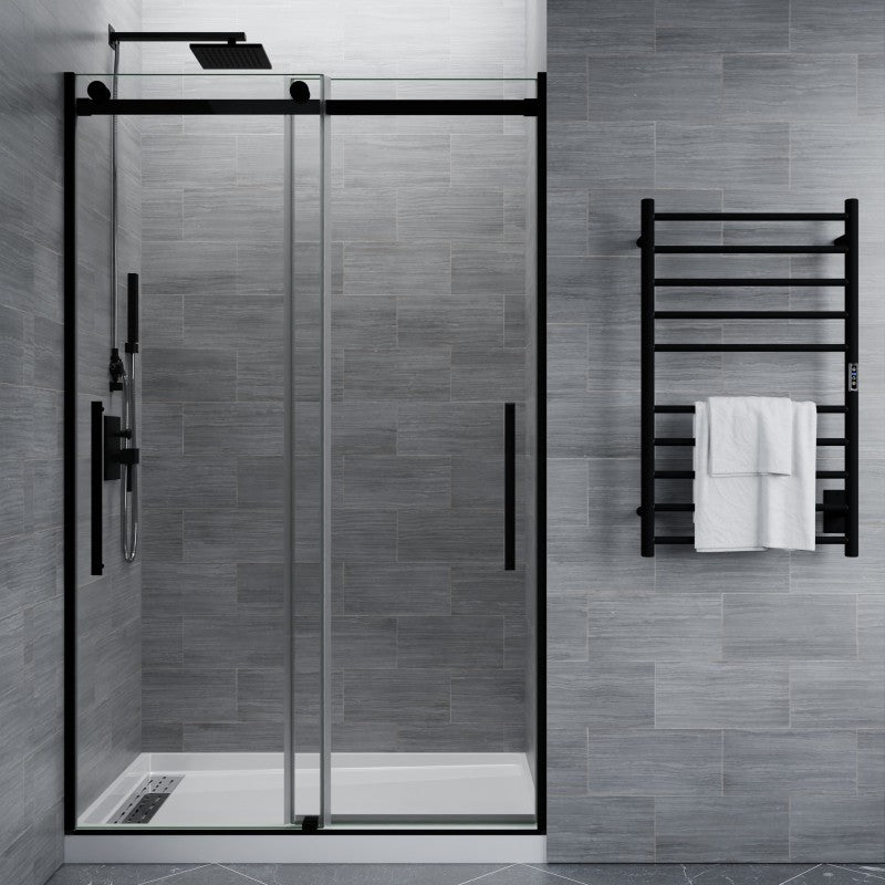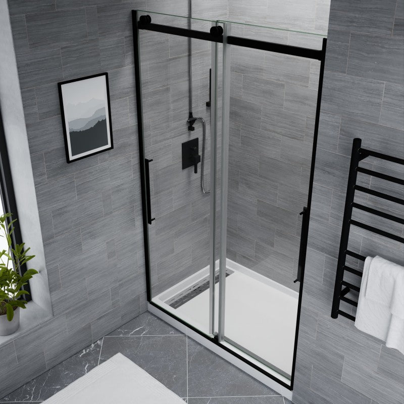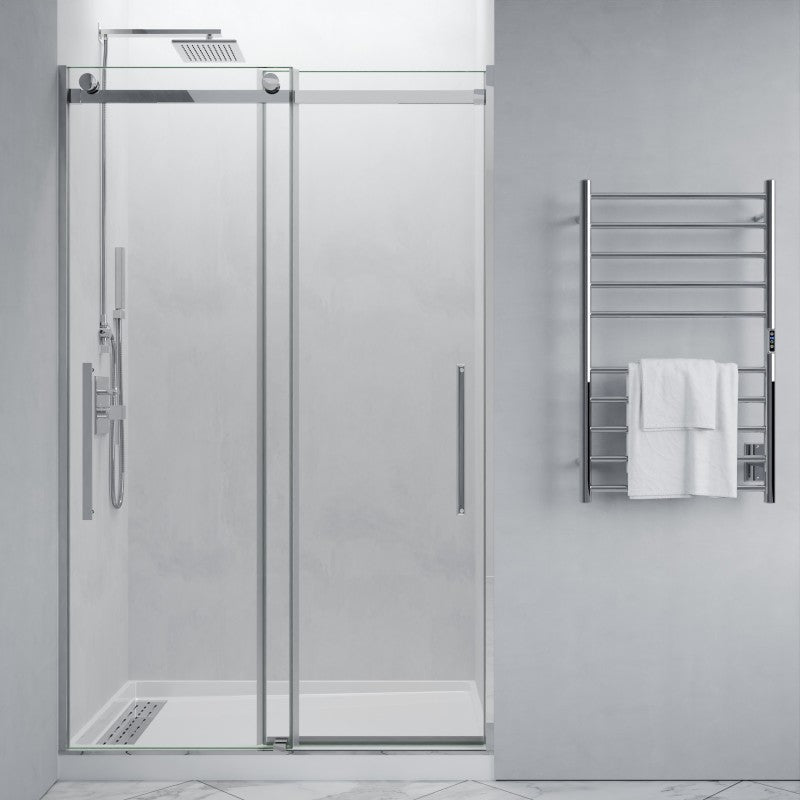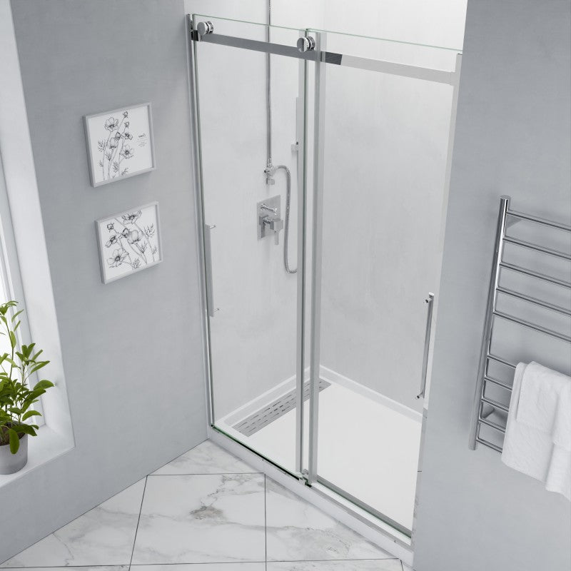 - The ultramodern frameless design with double sliding doors gives your shower a premium look