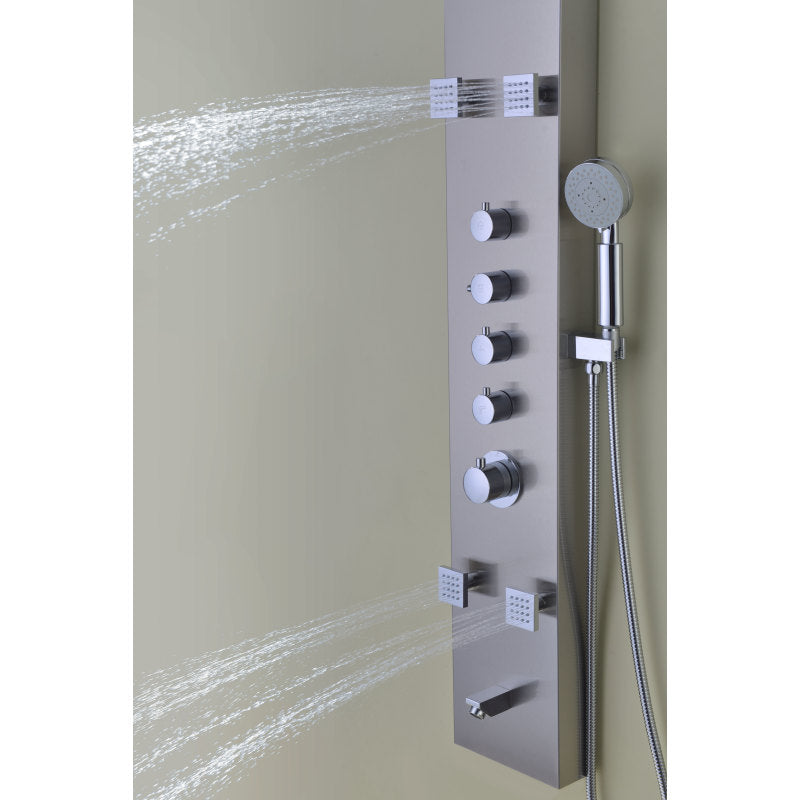 Echo 63.5 in. 4-Jetted Full Body Shower Panel with Heavy Rain Showerhead, Spray Wand and Tub Spout in Brushed Steel