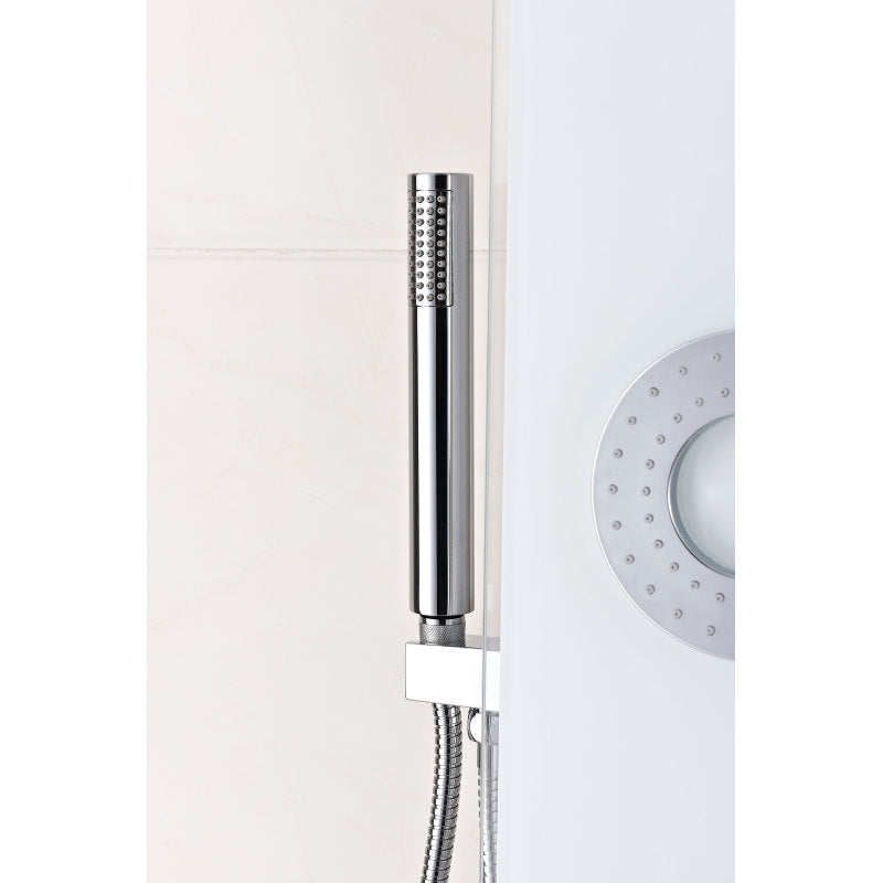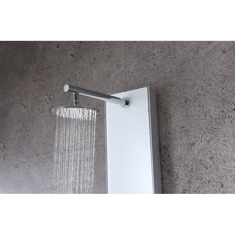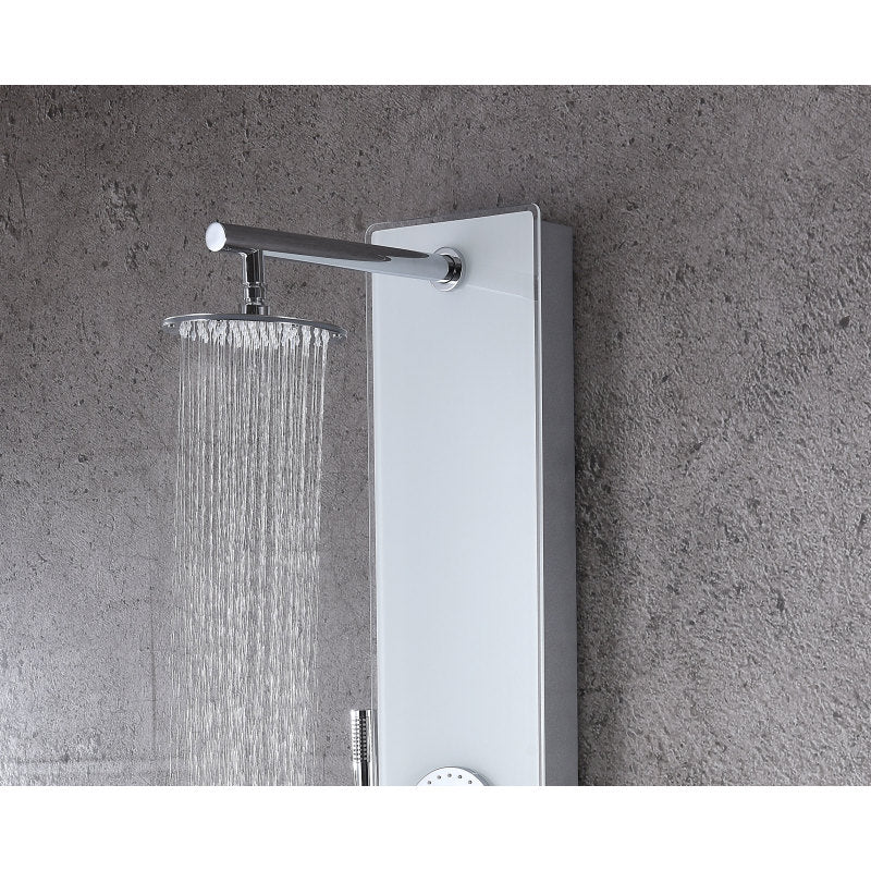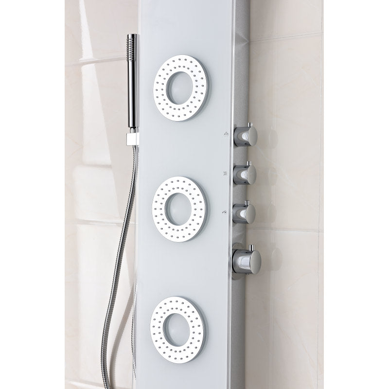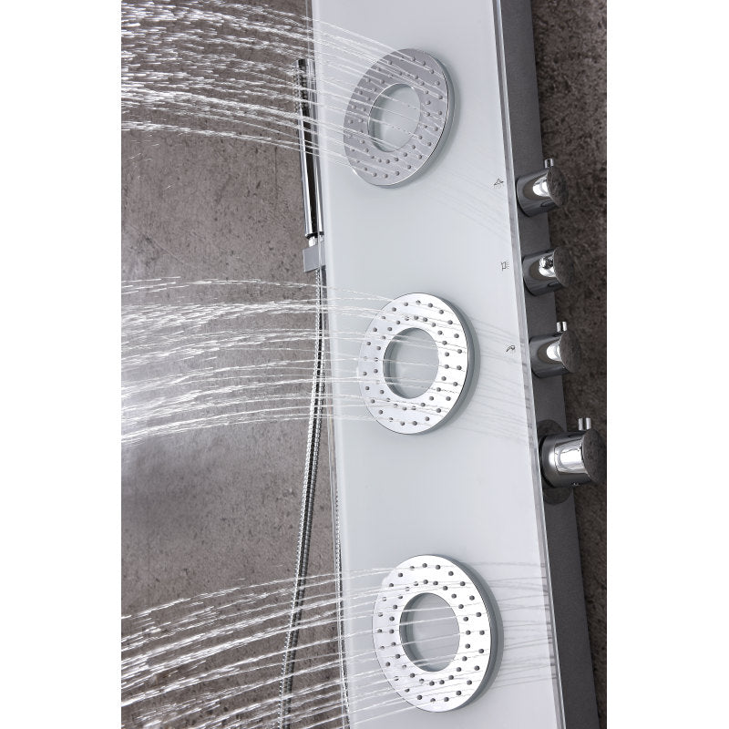 The ANZZI full body Lynn shower panel features a modern laser cut Tempered Glass body with 3 Acu-Stream body jets provide a relaxing yet powerful water stream to massage the body. The Heavy Rain shower head hangs overhead releasing a steady torrent of soothing water from above. And finally, always positioned at the column's flank is the Euro-Grip hand held sprayer with free reign reach of up to 60 inches. And everything is controlled through 4 chrome thermostatic and diverter controls.