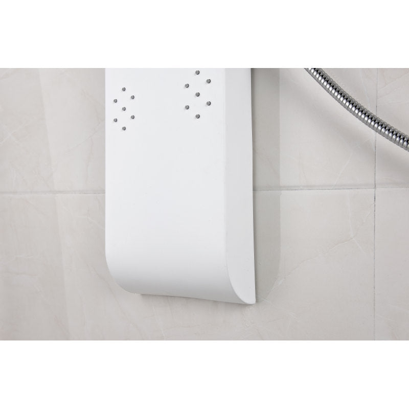The ANZZI full body Swan shower panel features a modern laser cut Aluminum body with 6 Acu-Stream body jets provide a relaxing yet powerful water stream to massage the body. The Heavy Rain shower head hangs overhead releasing a steady torrent of soothing water from above. And finally, always positioned at the column's flank is the Euro-Grip hand held sprayer with free reign reach of up to 60 inches. And everything is controlled through 2 chrome thermostatic and diverter controls.
