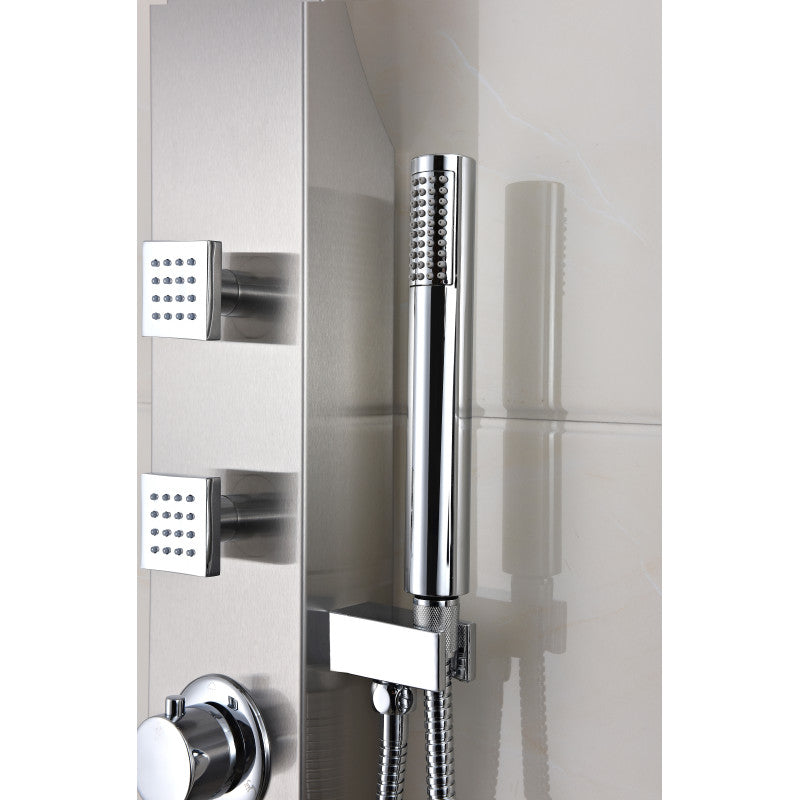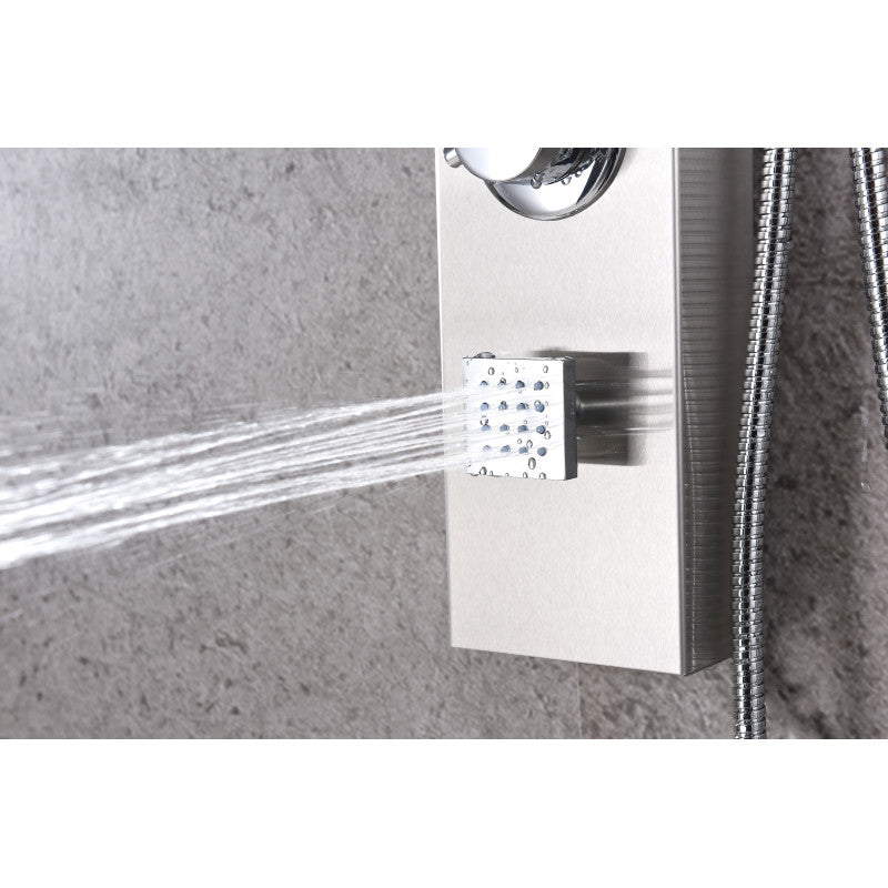 The ANZZI full body Sans shower panel features a modern laser cut brushed 304 stainless steel body with 3Acu-Stream body jets providing a relaxing yet powerful water stream to massage the body. The Heavy Rain shower head hangs overhead releasing a steady torrent of soothing water from above. And always positioned at the column's flank is the Euro-Grip hand held sprayer with free reign reach of up to 40 inches. And everything is controlled through 1 chrome diverter control.