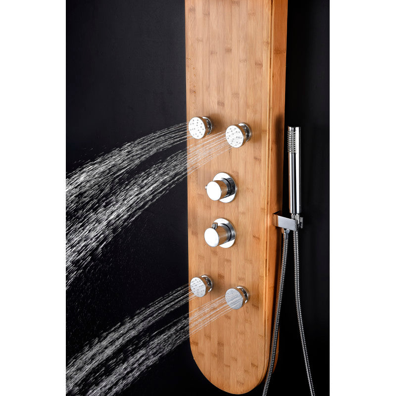 ANZZI is introducing the next level in personal jet stream shower technology with our latest series of elegant and reliably performing shower panels. The ANZZI full tower Mansion shower panel features a modern laser cut natural bamboo frame equipped with 4 Acu-Stream body jets providing a powerful water stream to massage the body. ANZZI shower panels feature true flow Heavy Rain performance hanging shower heads and Euro-Grip hand held sprayer. All features are controlled through 2 chrome finish thermostatic and diverter controls.