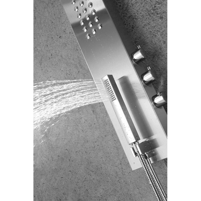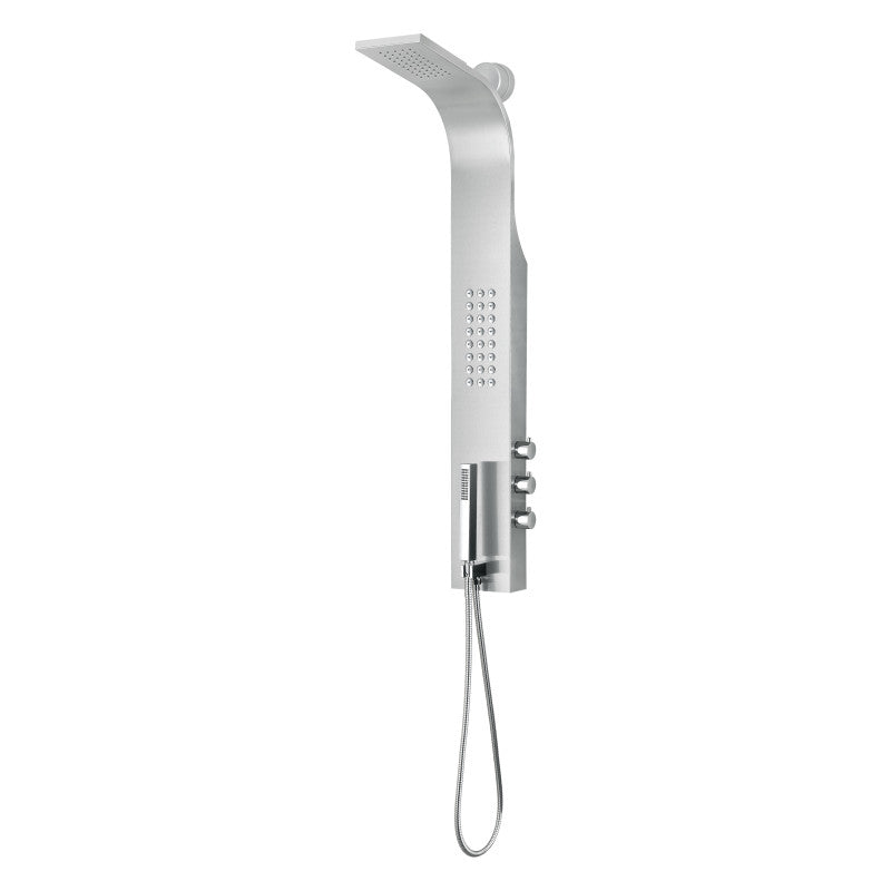 The ANZZI full body King shower panel features a modern laser cut brushed 304 stainless steel body with 1 Acu-Stream body jet providing a relaxing yet powerful water stream to massage the body. The Heavy Rain shower head hangs overhead releasing a steady torrent of soothing water from above. And always positioned at the column’s flank is the Euro-Grip hand held sprayer with free reign reach of up to 48 inches. And everything is controlled through 3 chrome diverter controls.